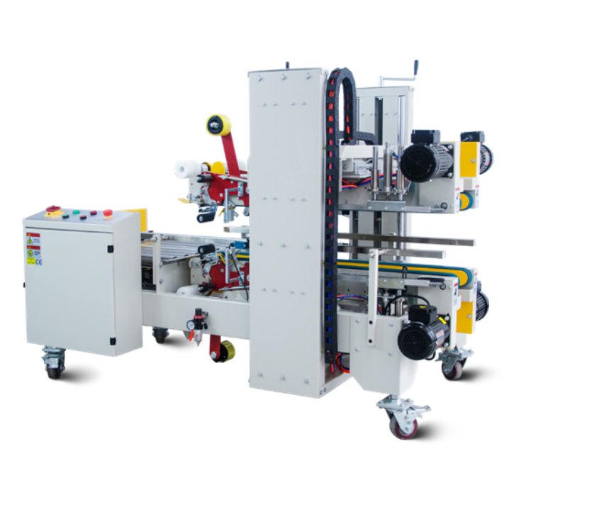 The semi-automatic carton corner sealer applies adhesive tape at the interface between the top and bottom surfaces of the carton and the side surfaces. First the tape is applied bottom and top, then it is pressed against the sides. The carton is driven by belts located at the top and bottom, ensuring smooth operation without interference. Simple manual adjustment ensures quick changeover to a new size and high productivity. The sealer is ideal for lightweight packaging, saves costs and provides an increase in production efficiency. The machine can be used in most industries, e.g. food packaging, household chemicals, white goods, toys, electronics. The solution is aimed at users with high requirements for product protection inside the packaging.
