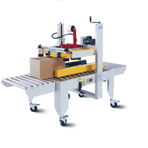 Półautomatyczna zaklejarka kartonów z systemem automatycznego dostosowania do rozmiaru kartonu, oraz z napędzanymi pasami bocznymi.