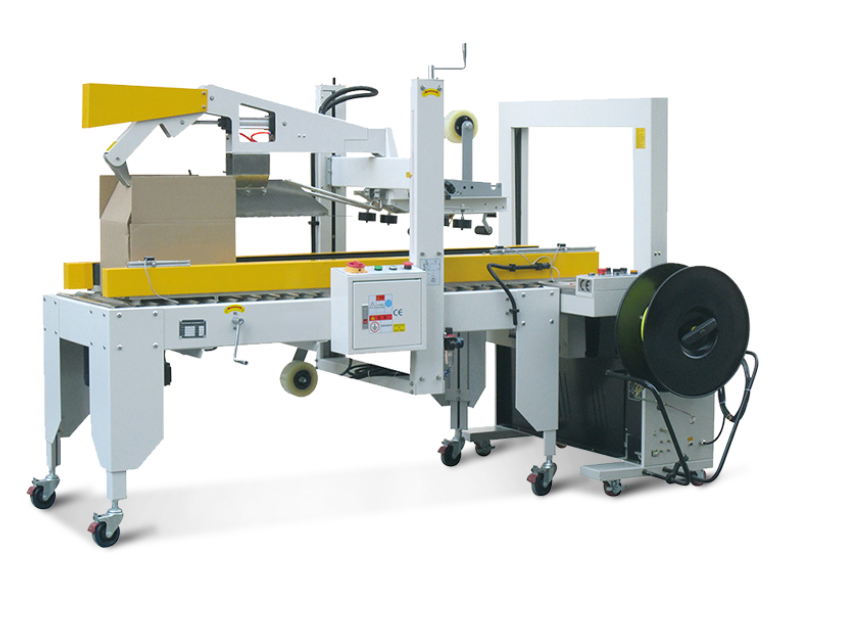 Półautomatyczna zaklejarka kartonów z automatycznym zamykaniem klap kartonu oraz ze zintegrowaną bandownicą.